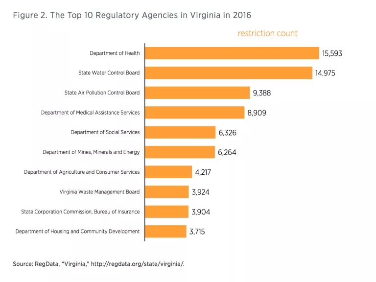 Within the titles of the VAC, chapters are grouped based on the regulatory department or agency that writes the rules housed within those chapters. Figure 2 shows that in 2016, rules from the Department of Health, which are found in title 12, contained over 15,500 restrictions. This makes the Department of Health the biggest regulator in Virginia. Coming in a close second was the State Water Control Board, whose rules can be found in title 9, which has just under 15,000 restrictions.