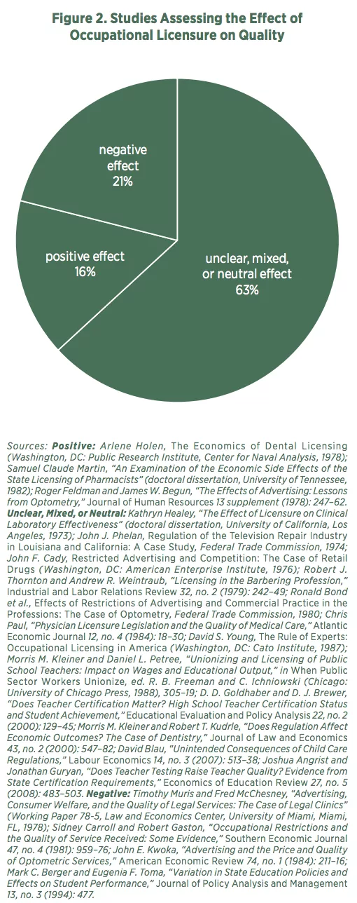 "With the caveats that the literature focuses on specific examples and that quality is difficult to measure, most research does not find that licensing improves quality or public health and safety."