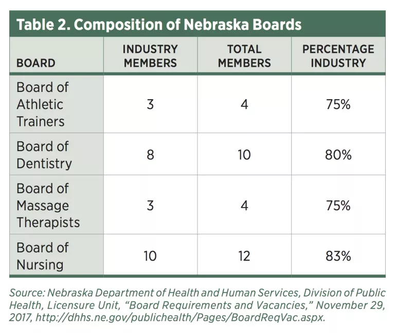 Industry domination of licensing boards is also problematic. Table 2 provides a snapshot of Nebraska board composition. In Nebraska, 81 percent of boards are required by law to have a majority of their members be license holders.