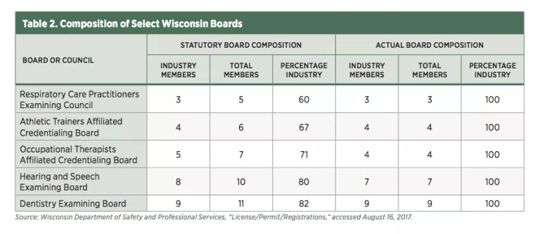 The membership of licensing boards poses an additional problem. As seen in table 2, most boards are required by statute to consist primarily of license holders, plus a few nonindustry members of the public. Eleven of Wisconsin’s 29 licensing boards currently have nonindustry seat vacancies, creating disproportionate representation of license-holding professionals. For example, because of public vacancies, the Athletic Trainers Affiliated Credentialing Board is now composed entirely of industry members.