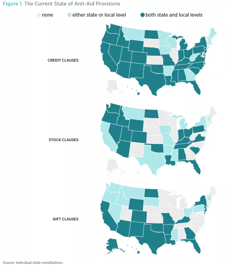 Forty-five states currently have constitutional anti-aid provisions. Figure 1 shows the current status. These provisions prohibit public financing of private entities in the form of (1) loans and credit (“credit clauses”), (2) stock subscriptions and joint ownership (“stock clauses”), or (3) appropriations, donations, grants, gifts, subsidies, or some combination thereof (“gift clauses”). Forty-four states currently have some variety of credit clause, prohibiting government bodies from lending money or credit for nonpublic uses. Thirty-two states currently have a stock clause prohibiting stock subscription in and joint ownership of private ventures. And twenty-nine states have a gift clause, prohibiting the government from disbursing public funds without consideration. Some states apply these provisions to the state government, others to local governments, and others to both.