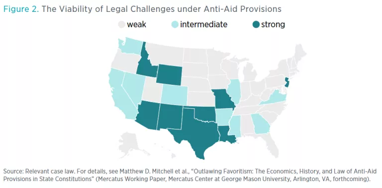 For more details on these provisions, their history, and their future prospects, see “Outlawing Favoritism: The Economics, History, and Law of Anti-Aid Provisions in State Constitutions,” by Matthew D. Mitchell, Jonathan Riches, Veronica Thorsen, and Anne Philpot.