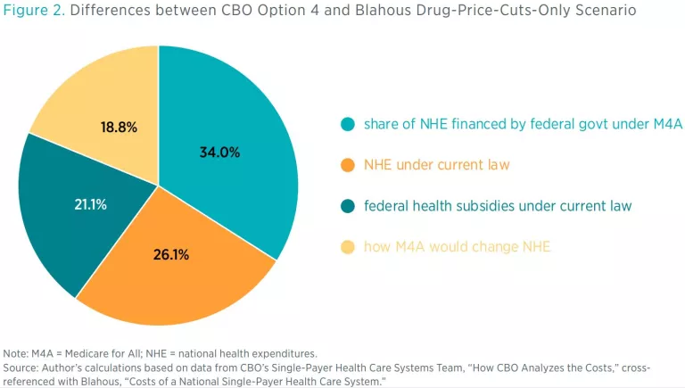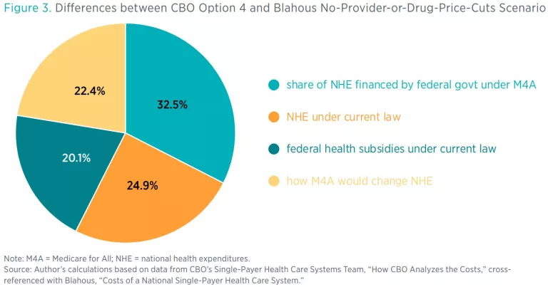 We can conduct a similar comparison between CBO’s Option 4 and my higher payment rate scenarios. For example, the 22.4 percentage points of difference between CBO’s Option 4 and my no-provider-or-drug-price-cuts scenario (see figure 3), with respect to how M4A would affect NHE, break down as follows: