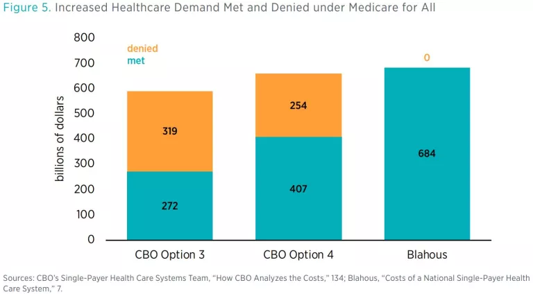 By contrast, CBO devoted a significant portion of its report to estimating the extent to which Americans would be denied care they sought under M4A. CBO projected that total healthcare would increase, but not by nearly as much as demand would increase. The demand increase under M4A would therefore produce two simultaneous phenomena: an increase in utilization and an increase in denial of care being sought. In sum, because of increased congestion in the healthcare system under M4A, there would be a substantial increase in the instances of Americans seeking healthcare without being able to receive it. Figure 5 provides the numbers.