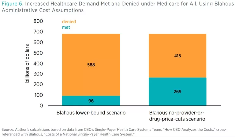 The details underlying these numbers only accentuate these concerns. In the left bar in figure 6, $81 billion of the $96 billion in increased healthcare supply consists of increased prescription drug supply, which CBO assumes can and will expand to fully meet demand. This means that under my modified calculation of less-complete administrative time eradication—and if M4A pays providers at Medicare rates—only about 2–3 percent of the increased demand for hospital, physician, and other healthcare services under M4A could be met, with the rest of the demand increase simply resulting in denial of care.