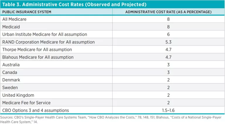 CBO’s administrative cost rate assumptions for M4A are not only lower than other analysts’ estimates, they are substantially lower than administrative cost rates in other US public insurance systems and in single-payer systems abroad, as table 3 shows.