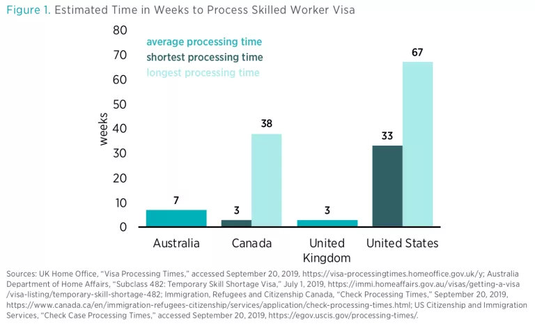 When applying for a temporary work visa, an important nonfinancial cost for both foreign employees and domestic employers is the processing time required for visa approval. Having to wait several weeks or even months for a visa to be processed can present a serious challenge for employers, particularly for small businesses, who may not have the time or resources to wait for a prolonged period. Long processing times can also be a determining factor regarding which country skilled foreign talent chooses to work in—long periods without gainful employment can be a significant disincentive for skilled workers to apply.