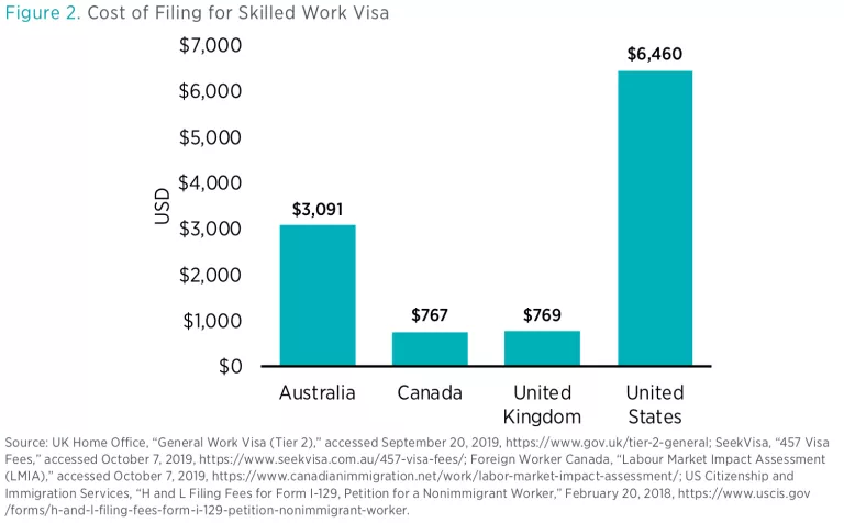 A second important cost to consider when comparing visa programs between countries is the financial cost to the employer of filing for the work visa. This does not include the cost of hiring an attorney, which in the United States can be an additional $2,000–$3,000 or more per applicant. Much the same as processing time, filing costs disproportionately burden small businesses, which may lack the financial resources to hire skilled foreign workers.