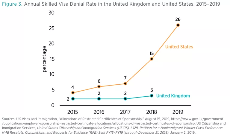 A third comparison of skilled visa programs that impacts the incentives of foreign workers in determining where to take their skills is the rate of denial, or conversely, odds of approval. When governments tighten their requirements and deny higher shares of visa applicants, fewer skilled workers apply for those visas. Visa programs with low rates of denial will incentivize more foreign workers to apply.