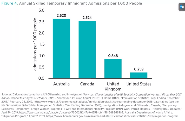 Comparing the absolute numbers of temporary skilled immigrants admitted annually is not an apples-to-apples comparison when considering the large variation in population size among the four countries in question. While the population of the United States is almost 330 million, the population of Australia is around 25 million. To see how open the four countries’ skilled (temporary) visa systems are to global talent, we need to review the numbers as a share of the population.