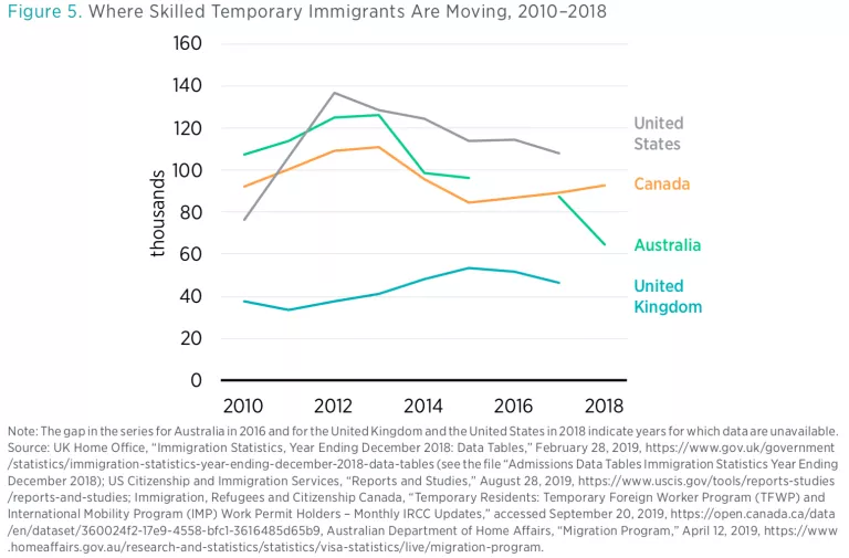 The job market in the United States is strong, and the technology industry, in particular, is booming. Interest in US tech jobs from foreign workers, however, is not. An increasingly restrictive and burdensome US immigration system is resulting in talented workers looking elsewhere for jobs. This trend is worrisome, because evidence shows that temporary foreign workers increase both employment and wages of American workers. This shifting pattern of skilled immigration raises two questions: Where are these skilled workers going, if not the United States? And why are they choosing these places over the United States?