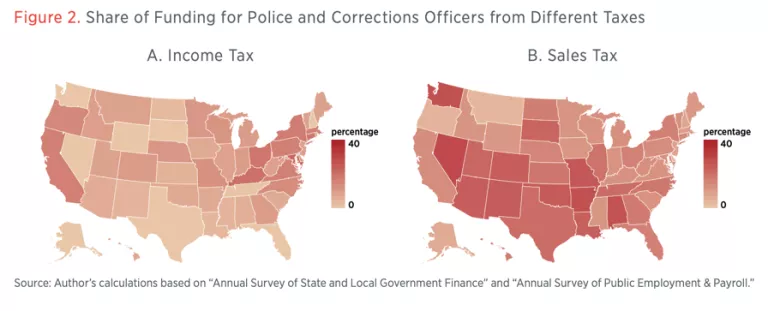 Alaska has the lowest percentage of funding for police and corrections officers stemming from either of these taxes. Instead, it relies heavily on revenue from sources like natural resources and “miscellaneous” general revenue.