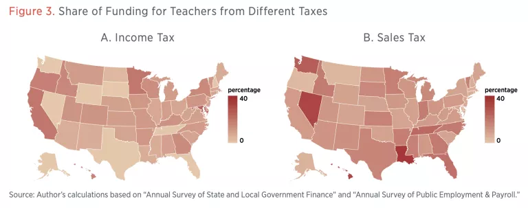 For each unit of government, we define the share of non–insurance trust revenue coming from personal income taxes and from sales taxes (including general sales, alcohol and tobacco sales, and other sales taxes). For local governments, we also calculate the share of revenue coming from the state government. We then allocate the intergovernmental share in proportion to the state’s own (nontrust) revenue sources, including income and sales taxes. This way we arrive at a sum of shares from sales and income taxes from both direct and indirect reliance on these taxes.