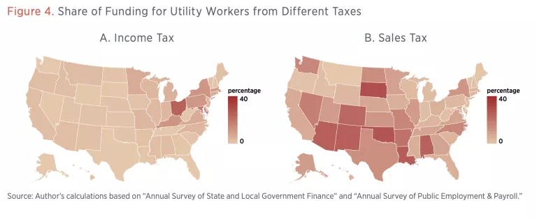 Correspondingly, sales taxes account for a larger share of public sector utility workers in other states (see figure 4b). States that do not rely heavily on either of these sources tend to rely on utility service revenue (as in Nebraska), on property taxes (New Hampshire), or on both (Maine and Vermont).