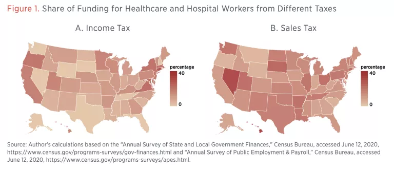 Crafting the correct immediate response involves understanding these nuances. Understanding which government functions are most sensitive to the COVID shock is crucial for targeting federal monies. We therefore focus in particular on the extent to which income and sales taxes pay for the salaries and benefits of different categories of workers. The public-sector workers we focus on are healthcare and hospital workers; police and corrections officers; teachers; and utility workers. These sensitivities are also important as we think about fine-tuning our system of fiscal federalism, which may currently provide too little revenue source flexibility for local authorities. In any case, before revealing the extent to which the pay of the workers we focus on relies on income and sales taxes across the states, let us provide a brief note on our calculations.