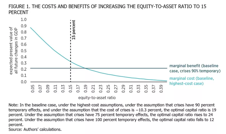 To illustrate the benefits and costs, we use a baseline estimate of the benefits based on empirically supported and conservative assumptions about the benefits while making the highest-cost assumptions. The assumed benefits arise from more capitalized banks having a lower likelihood of experiencing default, which lowers the likelihood of the damage of banking crises. The assumed costs arise from the fact that equity funding is assumed to be more expensive than debt, such that banks funded with more equity might pass along their higher funding costs to borrowing customers.