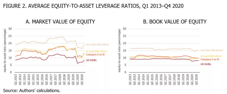 The figure shows that the GSIBs on average have the lowest average leverage ratios, whereas those with less than $50 billion have the highest average leverage ratios. The leverage ratios for Category II or III banks based solely on total assets rather than other activities and those with at least $50 billion on average fall in between those of banks less than $50 billion and those of US GSIB holding companies. Average leverage ratios measured using estimated market values tend to exceed the average leverage ratio measured using book values. Also, on average, banks with less than $50 billion in total assets have leverage ratios equal to about 15 percent when measured using book values and 20 percent when measured using market values, whereas the larger non-GSIB banks often have leverage ratios of 15 percent when measured using market values.