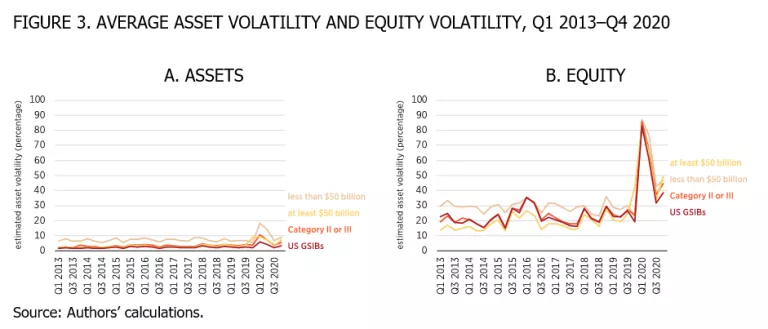 In spite of being less leveraged, figure 3 shows that, in terms of estimated asset risk, the smallest banks on average have a higher estimated asset volatility than larger banks. One way to explain this is that the largest banks tend to have much greater holdings of liquid securities and reserves and have a much smaller fraction of their assets allocated to loans, which would tend to lower asset volatility. But although estimated asset volatility is lower, the fact remains that the largest banking entities are more leveraged. In terms of the equity return volatility, earlier in the sample the smaller banking entities had a higher equity return volatility, but toward the end of the sample, the averages were similar.