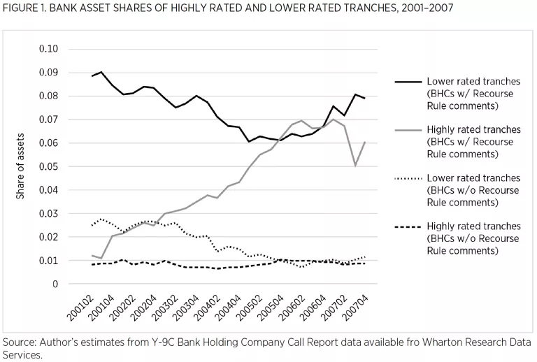 Figure 1 below depicts what happened before and after the final rulemaking. On average, the share of highly rated, private-label securitization tranches—held by the largest bank holding companies (BHCs) that were active in securitizing assets and submitting comments to influence the proposed Recourse Rule—increased, while the share of lower rated tranches decreased. [4] For BHCs that did not comment directly on the proposed Recourse Rule, the share of highly rated tranches remained low and constant, while the share of lower rated tranches decreased. So while the intent of the Recourse Rule was to encourage securitization without added risk-taking, it enabled asset-securitizing BHCs to create and also hold more highly rated tranches, some of which later were completely wiped out during the crisis. [5] BHCs that held more of the highly rated, private-label tranches had greater increases in equity-return volatility and risk of default during the crisis.