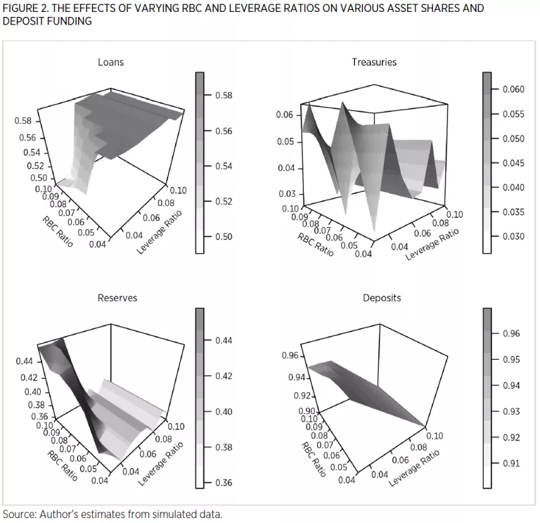 To illustrate this, figure 2 below shows what happens to a bank’s holdings of loans, reserves, and Treasuries, as well as deposit funding, as you increase the RBC ratio from 4 to 10 percent and the leverage ratio from 3 to 10 percent. The graph below is generated from solutions to a profit-maximizing bank’s optimal asset shares and the share of deposits that vary with the minimum RBC ratio from 4 to 10 percent and the leverage ratio from 3 to 10 percent. [12]