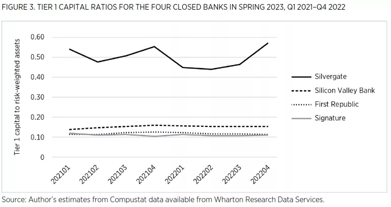 Whether the goal of RBC requirements is to protect depositors or prevent bank failures, the distressed banks satisfied RBC-based regulatory capital requirements, in spite of their complexity, in March 2023 just as they did in 2007–2009.13 While risk-weighting did not cause these banks to fail, it also did not prevent the recent bank failures in the spring of 2023. Figure 3 below shows that the RBC Tier 1 capital ratios of Silicon Valley Bank, Signature, and First Republic were all above 10 percent and changed little even as the banks became increasingly distressed. In the case of Silvergate, its Tier 1 capital ratio was over 50 percent before it eventually voluntarily liquidated!