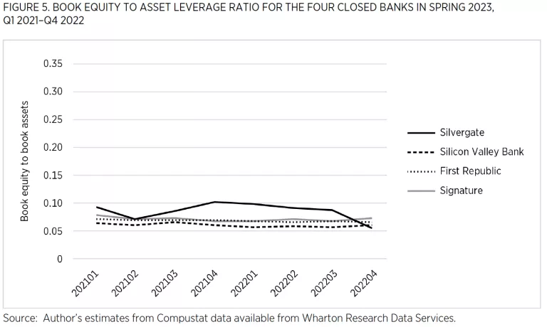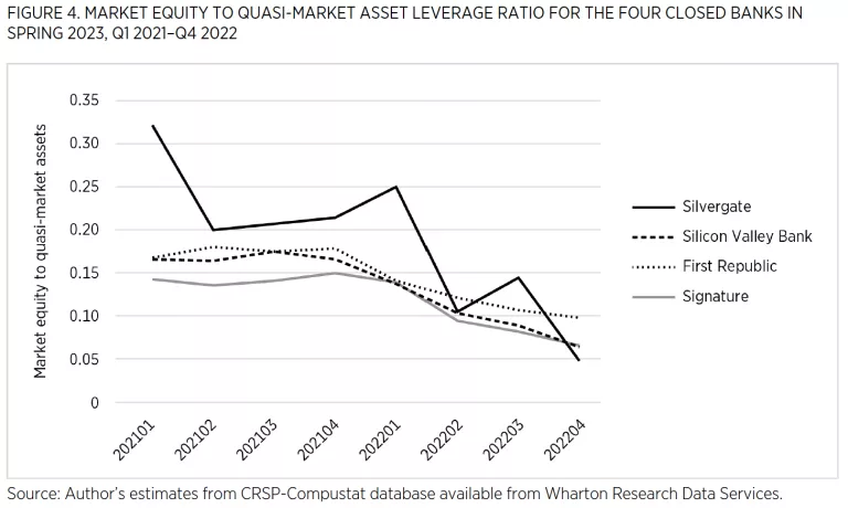 While the complex RBC ratios do not signal when a bank faces distress, simpler measures do. For instance, the quasi-market leverage ratio—the ratio of the market value of equity to the quantity of book assets minus book equity plus market value of equity—does indicate when a bank’s performance deteriorates. Figure 4 below shows the ratios for the three failed banks and Silvergate were declining throughout 2022, indicating that they faced deteriorating balance sheet conditions.