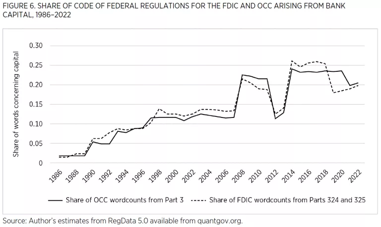 To visualize the growing verbosity associated with the complexity of regulation, figure 6 depicts the share of words in the Code of Federal Regulations on OCC capital regulation (Part 3, Title 12, Parts 1–199) and FDIC capital regulation (Parts 324 and 325, Title 12, Parts 300–399. The figure shows that capital regulation verbiage makes up an increasing fraction of words concerning banking.