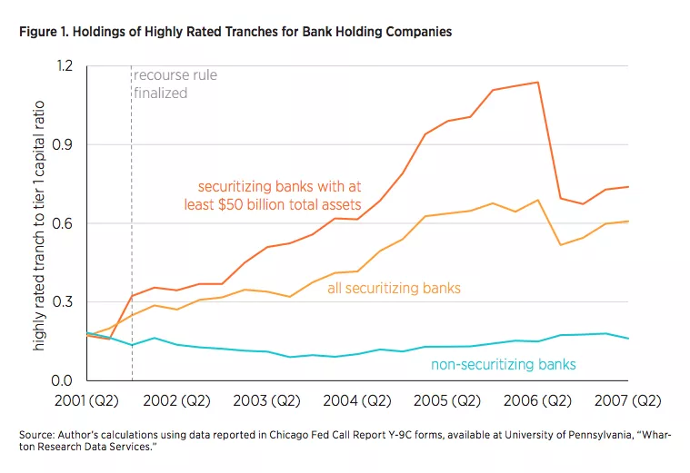 Related to this, steps 1 and 2 of the Minneapolis Fed Plan still make use of risk weighting, which may distort bank portfolio allocations. For instance, the vertical line highlighting Q4 2001 in figure 1 shows how securitizing bank holding companies on average tended to increase their purchases of the highly rated tranches, after the Federal Reserve, Federal Deposit Insurance Corporation (FDIC) and Office of the Comptroller of the Currency finalized the Recourse, Direct Credit Substitutes and Residual Interests Final Rule, or Recourse Rule in late 2001. The Recourse Rule could have distorted bank portfolio allocations by lowering risk-weights for the highest-rated tranches and increased the risk-weights for the below-investment-grade tranches. The Recourse Rule, accordingly, was intended to encourage securitization without encouraging ex ante risk-taking. Yet, an unintended outcome may have been that it encouraged both securitization and ex post risk-taking, as securitizing holding companies increased their holdings of the highest-rated products they created, which subsequently experienced significant writedowns.
