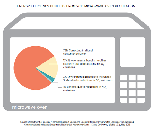 Using the Department’s primary estimate for the SCC, estimated benefits from reductions in CO2 emissions resulting from the microwave rule are $58.4 million per year (2011$). This number is dwarfed, however, by the supposed benefits resulting from correcting irrational consumer behavior, which are estimated at $234 million per year (2011$), implying that nearly 80 percent of the stated benefits from the regulation are due to correcting consumer irrationality. The chart below displays this information.8