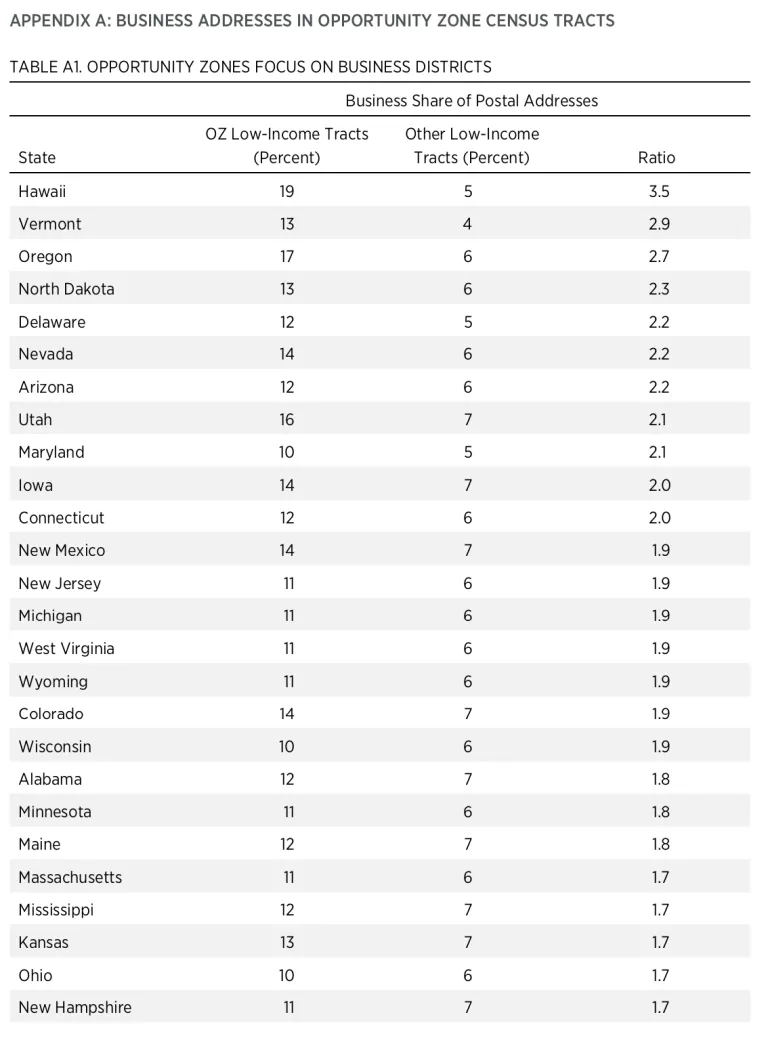 Nationwide, there is a clear trend in Opportunity Zone selection toward census tracts with strong business presences. In the average low-income Opportunity Zone, the share of business postal addresses was 10 percent, as compared to 6.8 percent in the average low-income census tract that was not designated and 5.9 percent in the average high-income tracts.