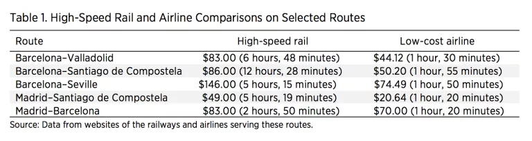 In Spain, it’s clear that airlines can be both cheaper and faster between terminals than HSR; thus any other advantages that passengers of HSR gain are relatively small. However, in some cases—for example, when there is congestion at the airports or when routes are suboptimally short for air travel—HSR is more attractive than air travel.