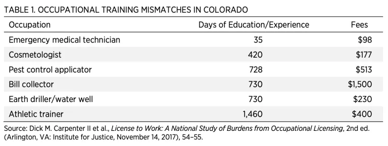 Licensure is often arbitrary. As shown in table 1, licensing requirements often don’t match the risk posed to the public by certain professions. Compared with emergency medical technicians, aspiring cosmetologists in Colorado must undergo 12 times as many months of training; would-be bill collectors (who are unlicensed in 20 states) must complete more than 21 times as much training; and athletic trainers must complete more than 40 times as much training.