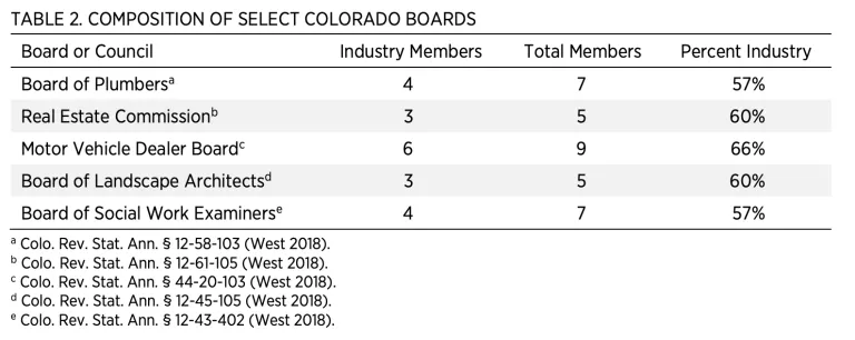 Licensing boards are dominated by members of the professions they oversee. About 80 percent of Colorado occupational licensure boards are required by law to have a majority of their members work in the professions they oversee. See table 2 for board composition data in a sample of Colorado boards. Owing to vacancies, many boards are composed entirely of industry insiders. This presents a legal concern in light of the US Supreme Court’s decision in North Carolina State Board of Dental Examiners v. FTC, which held that states may be liable for antitrust violations when boards are dominated by members of the professions they oversee and when elected officials fail to actively supervise these boards. It also creates a practical concern that boards will tend to act as industry cartels, controlling entry of new members rather than ensuring public safety.