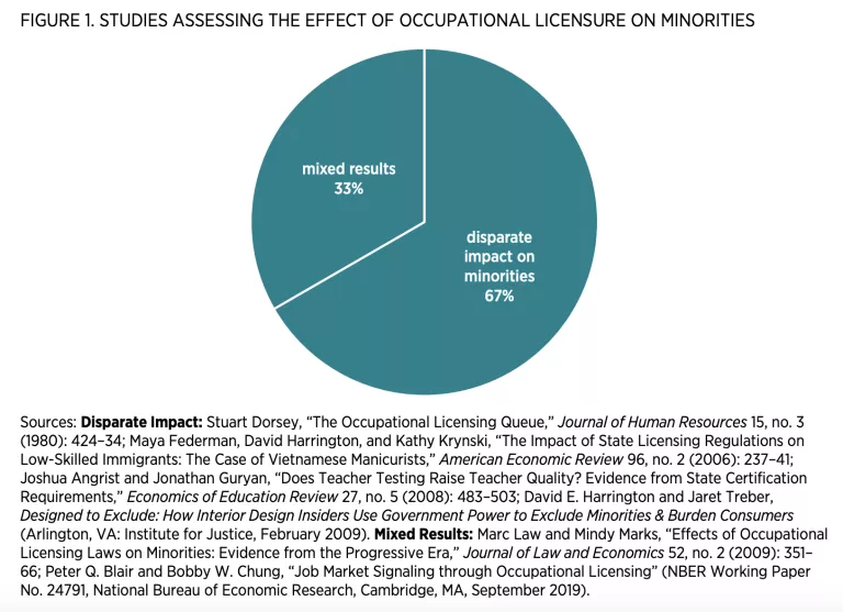 Licensing reduces employment opportunities and has a high incidence on economically vulnerable communities. High barriers to employment pose particular difficulties to lower-skilled, lower-educated populations, to immigrants, to those with criminal records, and to those who move frequently, such as military spouses. As shown in figure 1, 67 percent of the studies that assess licensure’s disparate impact find that it has a disproportionately negative effect on minorities.