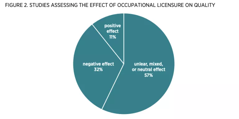 The most common justification for occupational licensing is that it is necessary to ensure quality and safety. However, the evidence in support of that justification is limited. In figure 2, I summarize the empirical work on licensure and quality. Nearly three-fifths of studies find that licensure either has mixed, unclear, or neutral effects on quality; one-third find a negative effect; and merely 11 percent of studies find a positive effect.