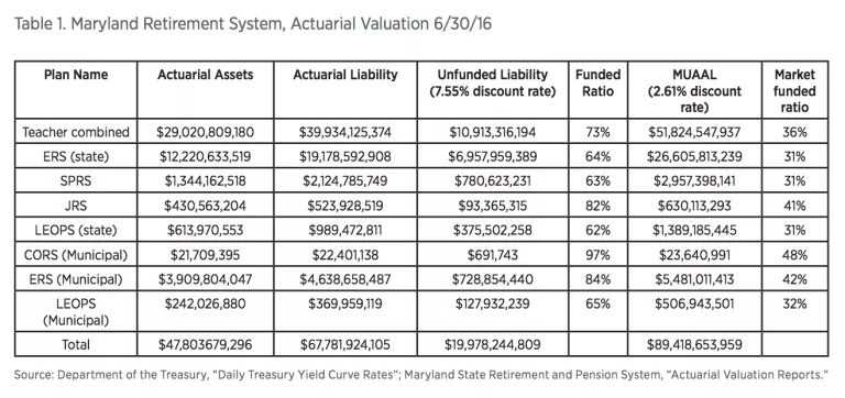 According to the actuarial reports, Maryland’s Retirement System faces an unfunded liability of $19.9 billion in FY 2016. These estimates are based on the state earning an assumed 7.55 percent on plan assets each year. When valuing these liabilities on a guaranteed-to-be-paid basis, based on the return on Treasury bonds, the unfunded liability is more than four times larger, or $89.4 billion. Recent investment returns have been poor for the retirement system, putting more pressure on the state to make up contributions.