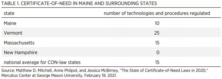 Table 1 shows the number of technologies and procedures regulated by Maine and by the surrounding states. Among all states with CON regulations, the average number of technologies and procedures regulated is 15. Maine regulates 10 technologies and procedures.