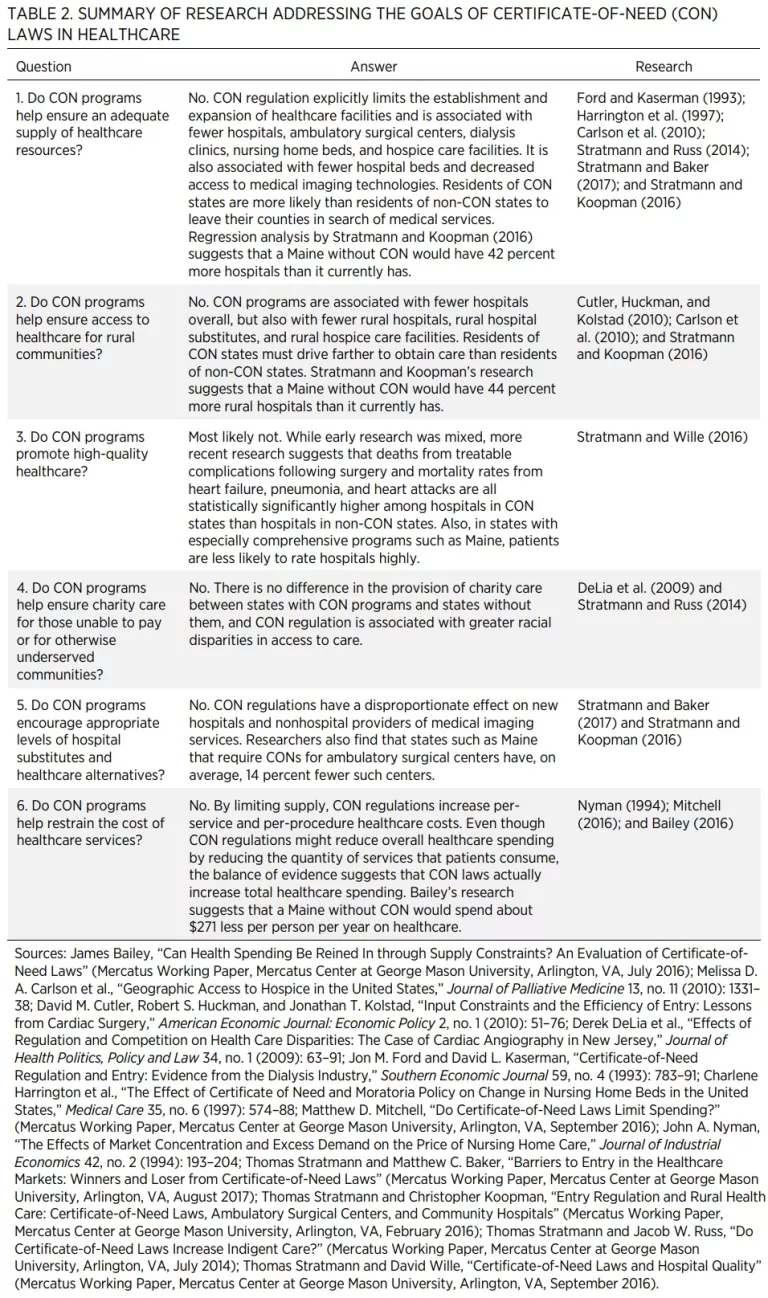 Researchers have ample information to help predict what would happen if Maine were to repeal its CON regulations because 15 states have repealed their CON programs, and others have pared theirs back. Economists have used modern statistical methods to compare outcomes in CON and non-CON states to estimate the effects of these regulations. These methods control for factors such as socioeconomic conditions that might confound the estimates. Table 2 summarizes some of this research. It is organized around the stated goals of CON laws.