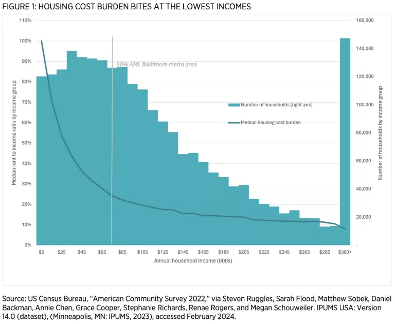 Many affordability requirements, however, are instead targeted to those earning 60 percent of area median income (AMI)—this is $73,000 in the Baltimore metro area. At that income, the median Maryland household spends just 24 percent of its income on housing costs, indicating that attainable options are available in most places.