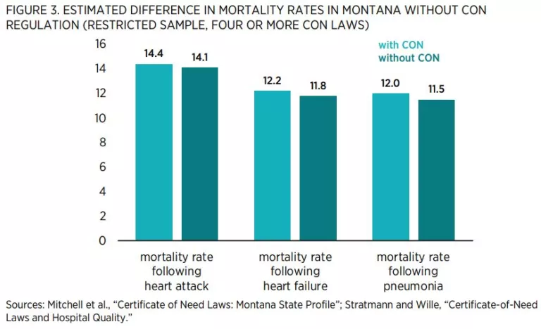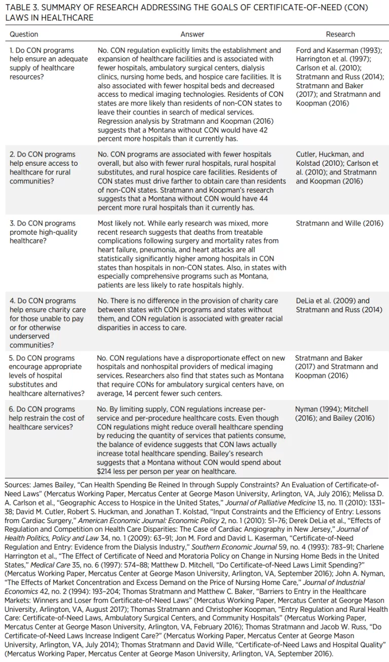 We have quite a bit of information to help predict what would happen if other states such as Montana were to repeal their laws because 15 states have repealed their CON programs and others have pared them back. Economists have been able to use modern statistical methods to compare outcomes in CON and non-CON states to estimate the effects of these regulations. These methods control for factors such as socioeconomic conditions that might confound the estimates. Table 3 summarizes some of this research. It is organized around the stated goals of CON laws.