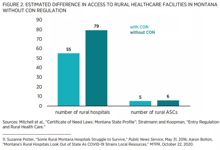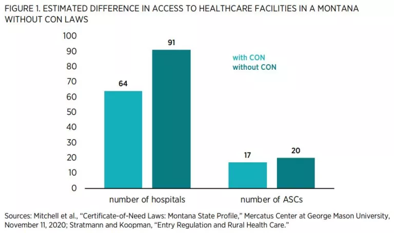 Figure 1 shows the actual number of hospitals and ambulatory surgery centers (ASCs) as well as the estimated number of hospitals and ASCs in a Montana without CON regulation.