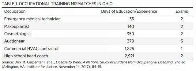 Licensure is often arbitrary. As shown in table 1, licensing requirements often don’t match the risk posed to the public by certain professions. Compared with emergency medical technicians, aspiring cosmetologists in Ohio must undergo 10 times as many months of training; would-be auctioneers (who are unlicensed in 20 states) must complete more than 10 times as much training; and high school coaches must complete more than 80 times as much training.