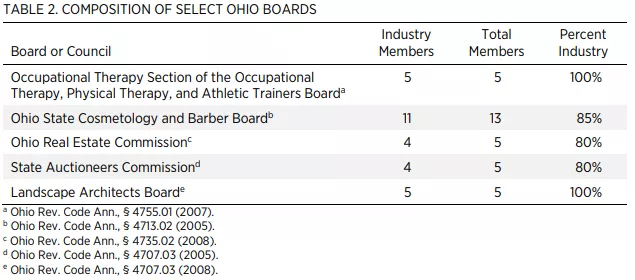 Licensing boards are dominated by members of the professions they oversee. About 86 percent of Ohio occupational licensure boards are required by law to have a majority of their members work in the professions they oversee.[3] See table 2 for board composition data in a sample of Ohio boards. Owing to vacancies, many boards are composed entirely of industry insiders. This presents a legal concern in light of the US Supreme Court’s decision in North Carolina State Board of Dental Examiners v. FTC, which held that states may be liable for antitrust violations when boards are dominated by members of the professions they oversee and when elected officials fail to actively supervise these boards.[4] It also creates a practical concern that boards will tend to act as industry cartels, controlling entry of new members rather than ensuring public safety.
