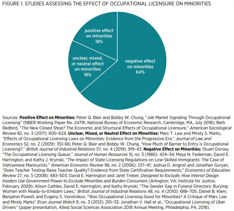 As shown in figure 1, 64 percent of the studies that assess the effect of licensure on minorities have found that it has a negative effect. The remaining studies are split evenly between finding a positive effect on minorities or a mixed, neutral, or unclear effect.