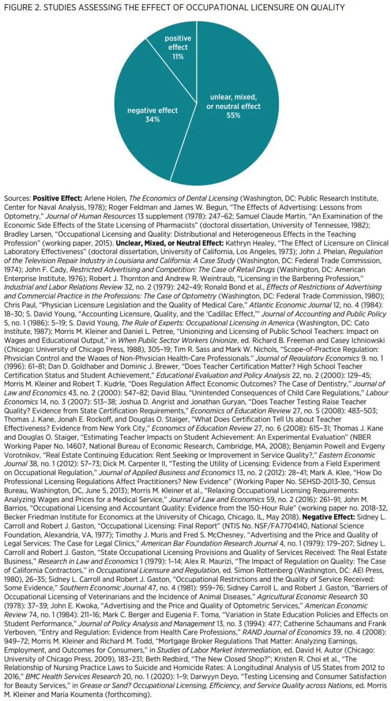 Because the economic theory is ambiguous, one must turn to the data. In figure 2, I present a survey of the empirical work on licensure and quality. Most studies find that licensure either has mixed, unclear, or neutral effects on quality. Interestingly, however, more studies find a negative effect of licensure on quality than find a positive effect.