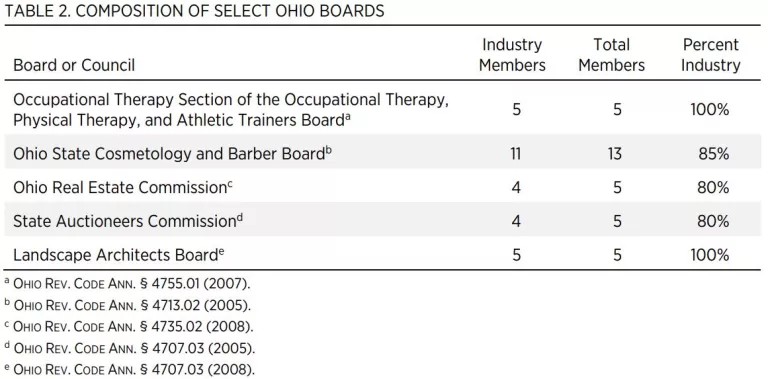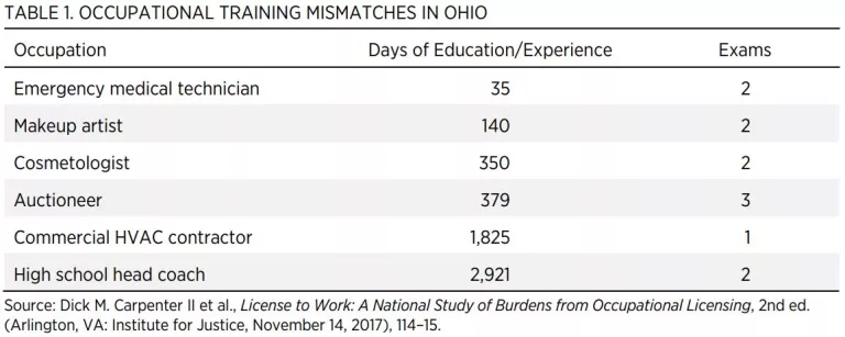 Licensure is often arbitrary. As shown in table 1, licensing requirements often don’t match the risk posed to the public by certain professions. Compared with emergency medical technicians, aspiring cosmetologists in Ohio must undergo 10 times as many months of training; would-be auctioneers (who are unlicensed in 20 states) must complete more than 10 times as much training; and high school coaches must complete more than 80 times as much training.