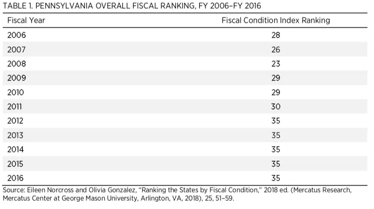 My name is Eileen Norcross. I am vice president for policy research and a senior research fellow at the Mercatus Center at George Mason University. My research focuses on state and local fiscal institutions and policies with an emphasis on the solvency of state pension plans and the comparative fiscal performance of the states. Thank you for inviting me today to provide testimony on the current fiscal condition of Pennsylvania.