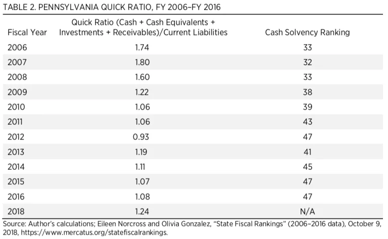 Between FY 2006 and FY 2016, Pennsylvania’s cash metrics declined steadily. Cash solvency measures whether a state has enough cash on hand to cover short-term bills, which include accounts payable, vouchers, warrants, and short-term debt. Cash solvency consists of three metrics: the cash ratio, the quick ratio, and the current ratio. The quick ratio measures liquid forms of cash, including cash, cash equivalents, investments, and receivables as a percentage of current liabilities. Generally, a healthy quick ratio should be greater than one. While Pennsylvania has only once fallen beneath the threshold for the minimum amount of cash needed to cover short-term liabilities, the trend line points to the risk that the state may not have much of a buffer, should a recession occur. Pennsylvania’s quick ratio fell from 1.74 in FY 2006 to a low of 0.93 in FY 2012, indicating that short-term liabilities exceeded cash by 7 percent in that year. The quick ratio climbed slightly, reaching 1.08 in FY 2016. Updating this metric for FY 2018 shows continued improvement, with a quick ratio of 1.24. As table 2 shows, over the period, Pennsylvania’s ranking for cash solvency dropped from 33rd to 47th.