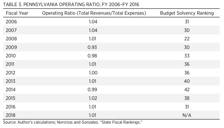 In my testimony today I will focus on our most recent 10-year study of fiscal condition as it pertains to the Commonwealth of Pennsylvania’s finances. First, I provide basic data on Pennsylvania’s performance for these indicators over a decade (since our study extends only to FY 2016, I have updated three key metrics using FY 2018 Comprehensive Annual Financial Reports [CAFRs] for today’s discussion). I will put these measures in the context of recent fiscal reforms and make three recommendations related to these reforms and ongoing challenges the state is facing: