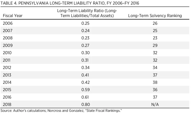 In FY 2006, long-term liabilities were 25 percent of total assets. In FY 2016 they were 61 percent of total assets. This increase is attributable to a change in how states are required to report pension liabilities. In FY 2015 states began to comply with Governmental Accounting Standards Board (GASB) Statement 68, which requires states to report unfunded pension liabilities on their balance sheet. As table 4 shows, Pennsylvania’s long-term liability-to-asset ratio rose from 42 percent in FY 2014 to 53 percent in FY 2015, and again to 61 percent in FY 2016, owing to the fuller recognition of unfunded pension liabilities in the financial statement.